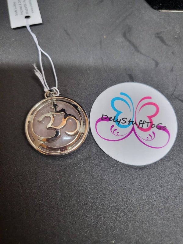 Een stuk rozenkwarts gevat in een hanger met een ohm symbool.